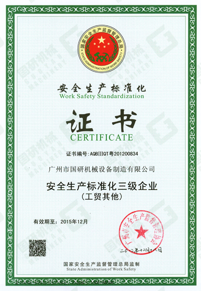 2012年12月24日,國家安全生產(chǎn)監(jiān)督管理總局為國研機械公司頒發(fā)了《安全生產(chǎn)標(biāo)準(zhǔn)化企業(yè)證書》,這意味著我司已達到《廣州市工業(yè)企業(yè)安全生產(chǎn)標(biāo)準(zhǔn)化評定辦法》及《廣州市工業(yè)企業(yè)安全生產(chǎn)標(biāo)準(zhǔn)化評定標(biāo)準(zhǔn)》的要求。