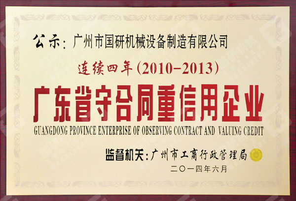 2014年7月,廣州市國研機械設(shè)備制造有限公司獲得由廣東省工商行政管理局授予的2013年度“廣州省守合同重信用企業(yè)”榮譽稱號。這是公司連續(xù)多年來多次獲此殊榮。