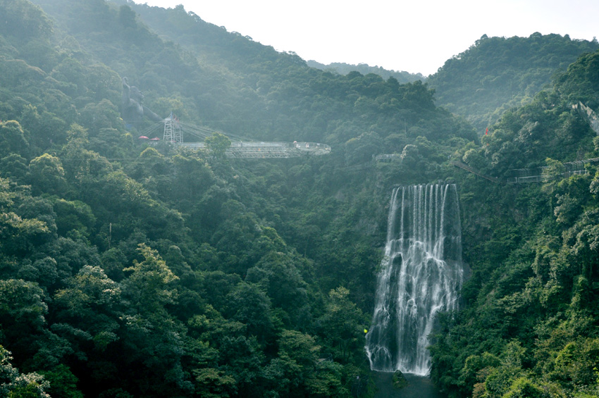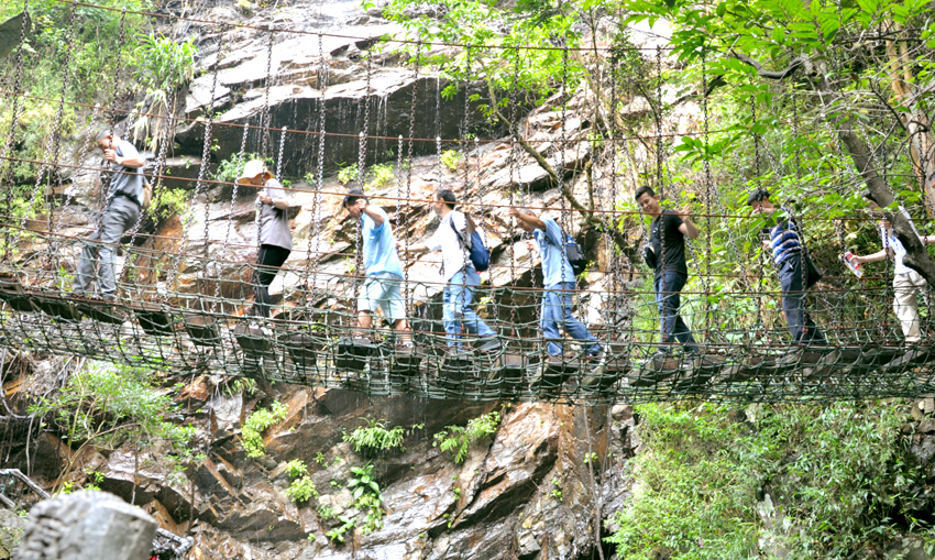 兩小時(shí)的小北江之游,大家都還余味未盡。導(dǎo)游又帶上大家趕往這次團(tuán)建活動的重頭戲的目的地:古龍峽的“云天波霸”。今天公司參加團(tuán)建的所有員工都要挑戰(zhàn)目前世界上較寬的高空玻璃橋,玻璃橋像一條通體透明的巨龍連接著峽谷兩岸,橋下懸空超過100米,站在橋上向下看,真是令人心驚膽戰(zhàn),大家相互鼓勵(lì),三三兩兩牽手前行,用相互的關(guān)愛順利通過并成功抵達(dá)世界較大直徑的懸空玻璃平臺。盡管大家都汗流浹背,但每個(gè)人臉上都洋溢著喜悅。因?yàn)榇藭r(shí)大家都收獲了克服恐懼心理后戰(zhàn)勝困難的勇氣和成功!