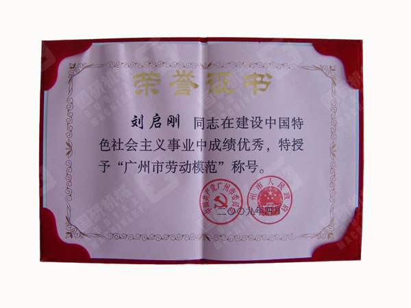 廣州市委、市政府授予劉啟剛同志廣州市勞動模范榮譽證書