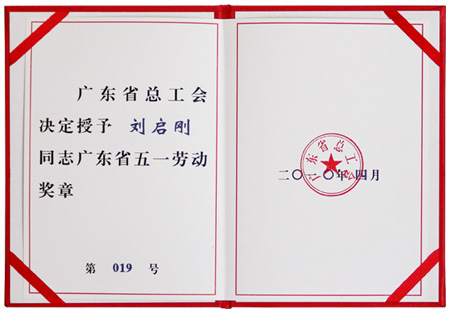 廣東省委、省政府授予劉啟剛同志廣東省五一勞動(dòng)獎(jiǎng)?wù)?/p>