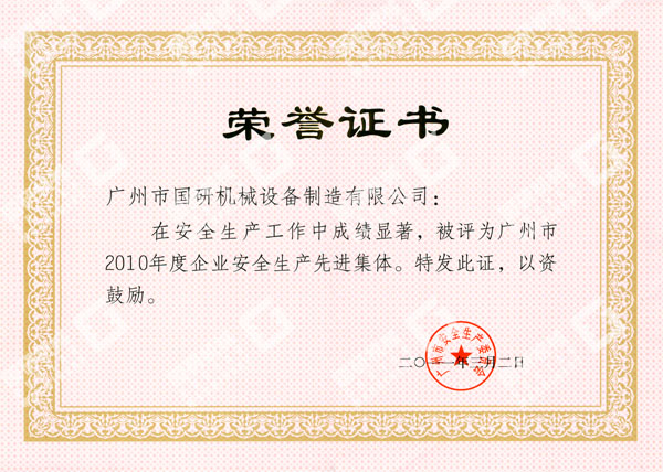 國研機械榮獲“廣州市2010年度企業(yè)安全生產(chǎn)先進(jìn)集體”稱號